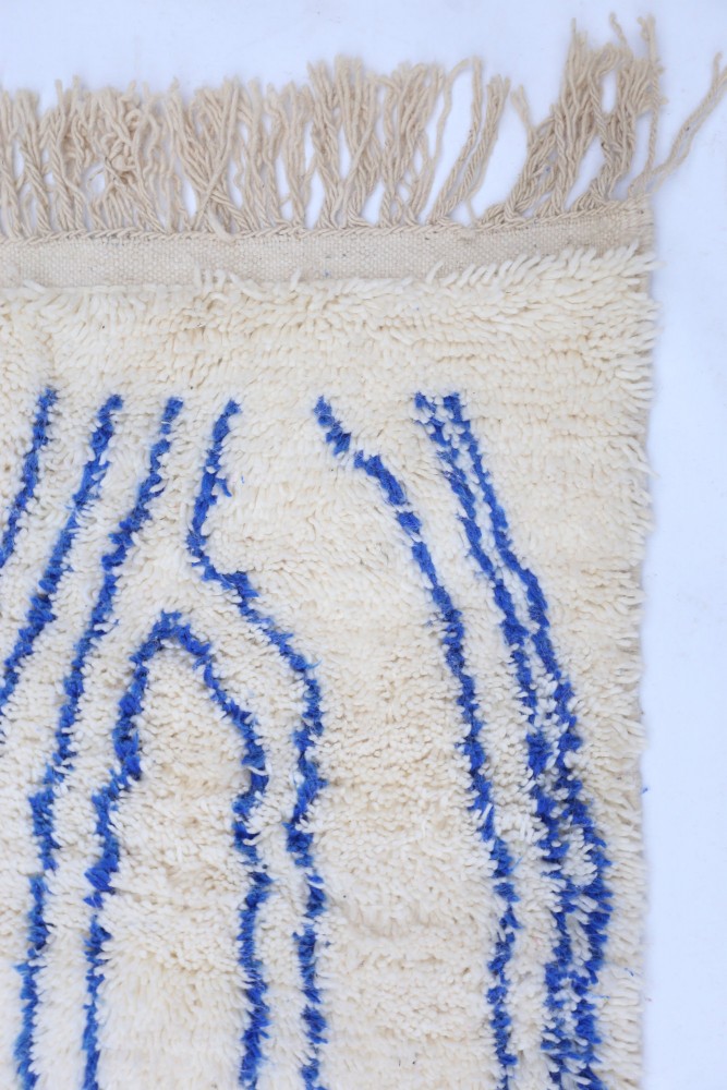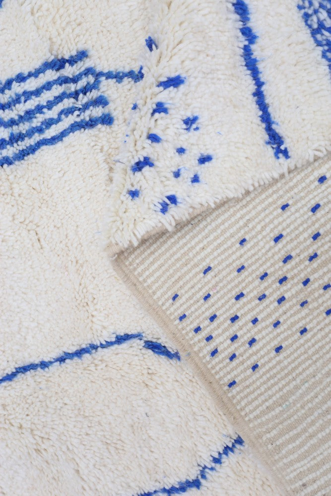 Striking handwoven Beni Ourain rug from Morocco, featuring bold abstract blue tribal lines on a creamy wool base. A perfect statement piece for bohemian or contemporary interiors.