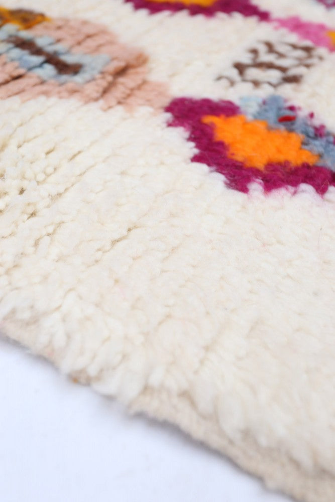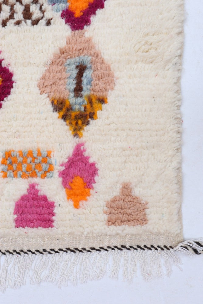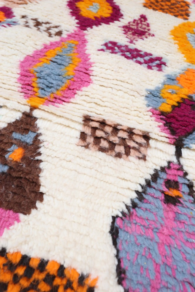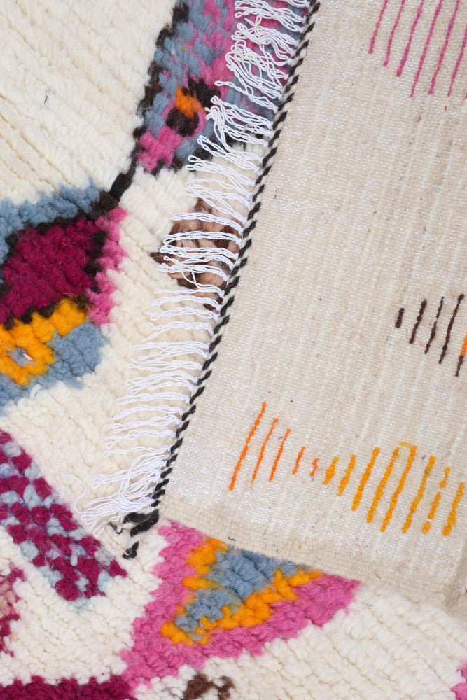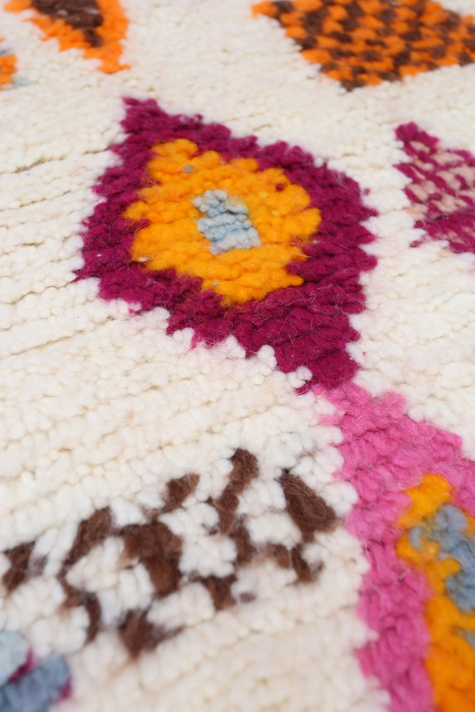 Add a burst of joy to your floor with our Candy Crush Azilal rug. This authentic, hand-knotted Moroccan masterpiece is like a visual sugar rush for your home. Made from 100% natural wool, it features a playful mix of neon pinks, electric oranges, and deep purples against a creamy white canvas.