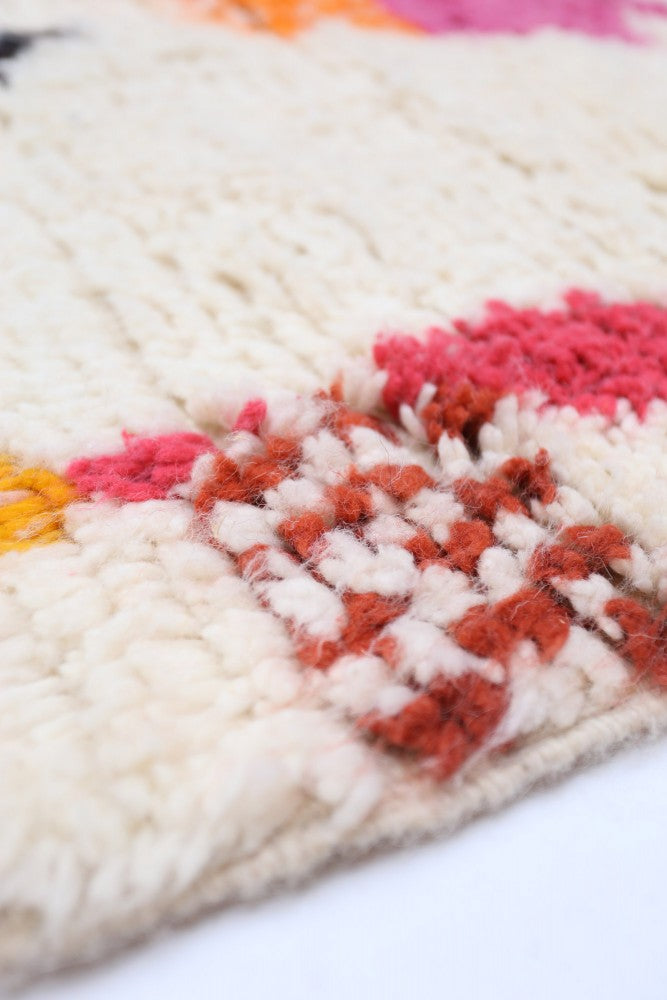 Stop everything and look at this! This is the kind of rug that turns a dull corner into a masterpiece. We call it the 'Joyful Vivid Zig-Zag' because it's exactly that pure, energetic fun! It’s an authentic, hand-knotted Azilal, made from beautiful 100% Moroccan wool, and it measures a perfect 248 x 147cm. The creamy background is the perfect stage for a crazy cast of abstract diamonds, vibrant color blocks (that hot pink and orange are everything!), and those amazing, eye-catching zig-zag patterns. It's got wonderful texture and an organic, modern feel that makes it the definition of floor art. If your room needs a shot of bold, bohemian joy, this is your new best friend.