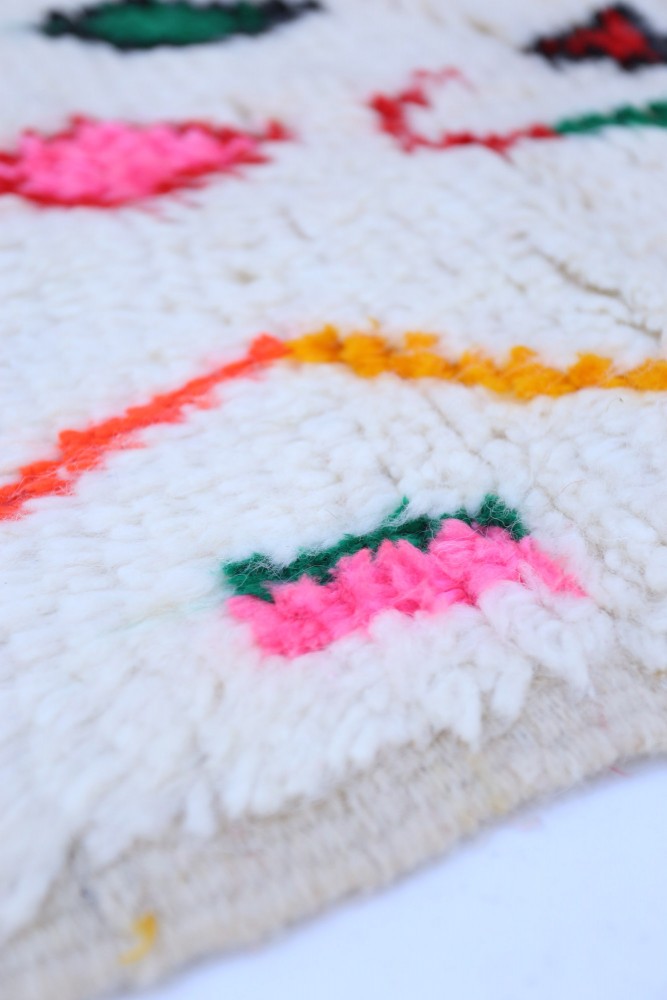 nfuse your space with character and charm. This 156 x 104 cm Moroccan Azilal rug from Knot & Hue’s Joyful Collection is handcrafted from 100% wool by Berber artisans in the Atlas Mountains. With its vibrant diamond motifs and cheerful palette, it’s perfect for brightening up smaller rooms, reading nooks, or playful corners.