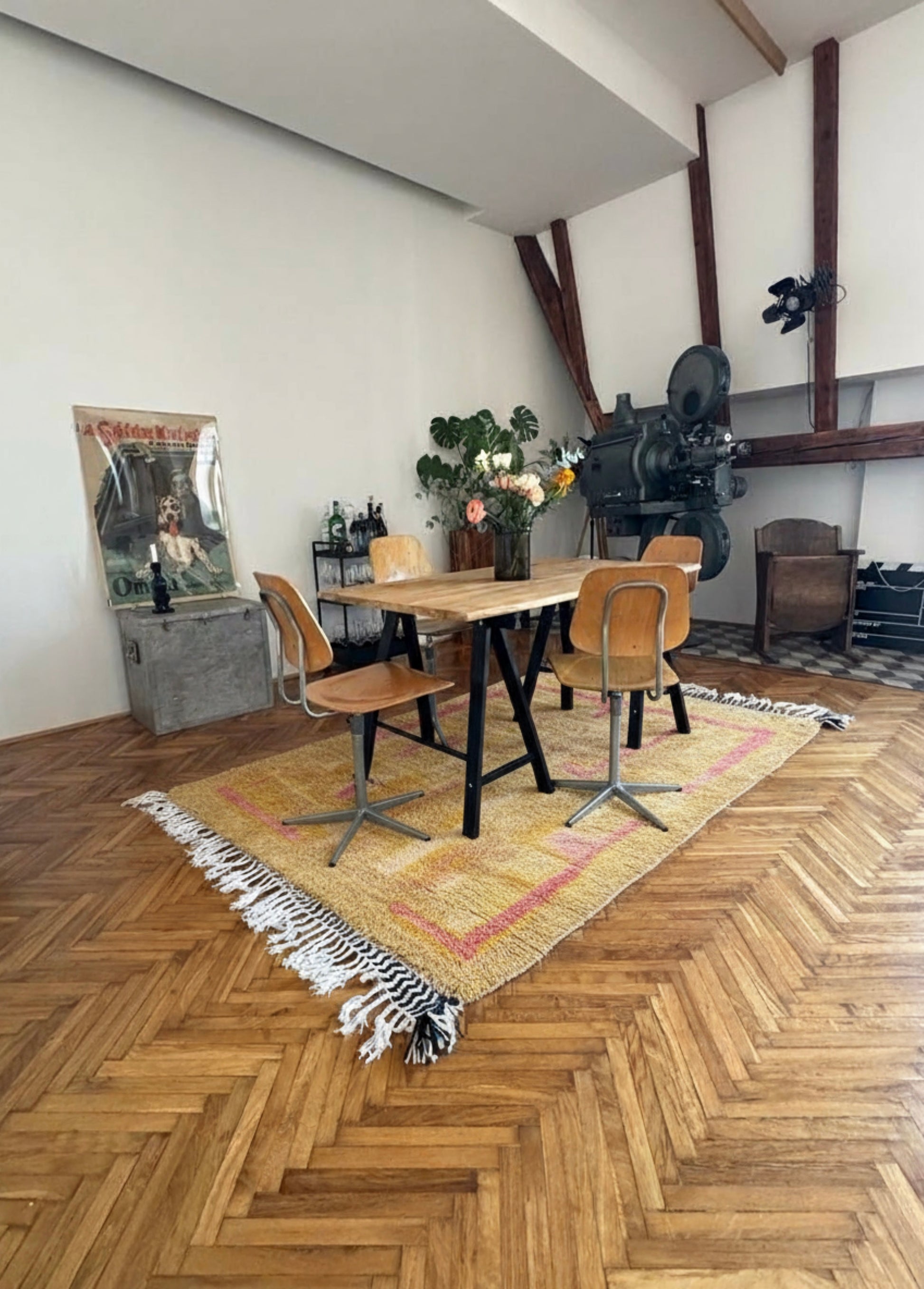 This 100% wool Azilal rug is bursting with personality. Hand-woven with a luxurious, deep pile, it feels like walking on a cloud. The base is a beautiful, rich saffron-ochre that feels warm and grounding. But the real surprise is the pattern: bold, spontaneous lines of vibrant fuchsia-pink and sunshine yellow cut through the shag, creating a gorgeous vintage geometry.