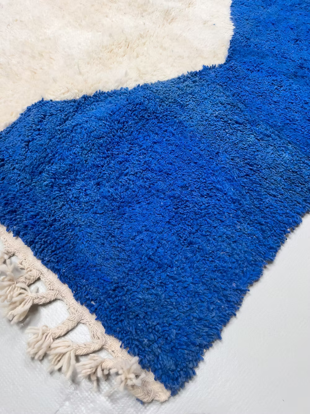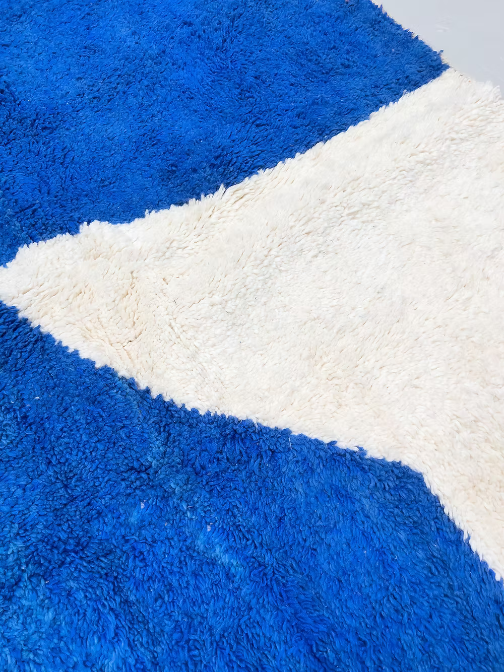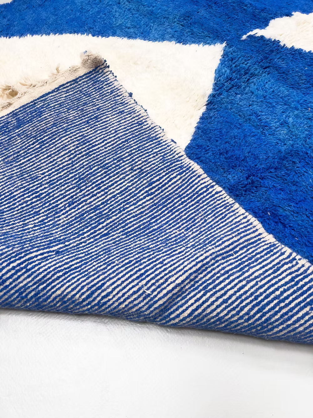 Handwoven in the Atlas Mountains by Berber women, this authentic Beni Ouarain rug carries the calm strength of tradition and the vivid soul of Majorelle blue. Its creamy wool base meets geometric blue lines that recall desert paths under the morning sky. Soft, timeless, and deeply rooted in Moroccan heritage — a piece that tells a story with every thread.