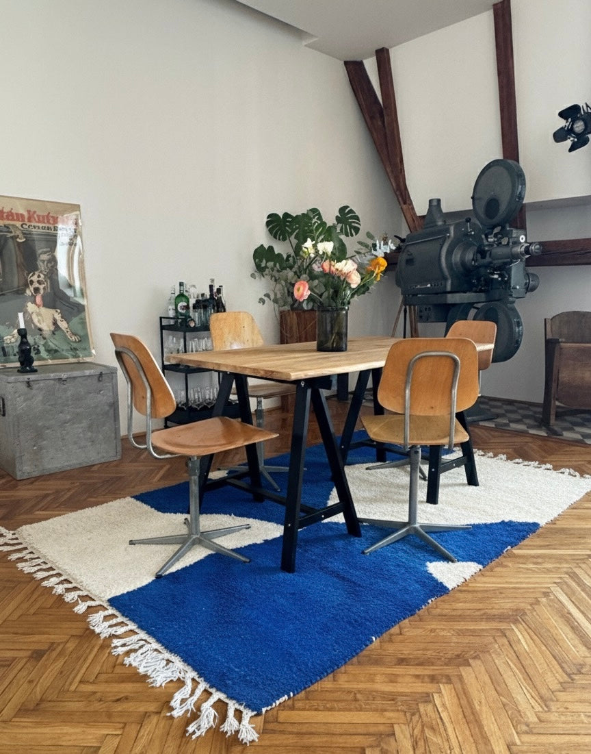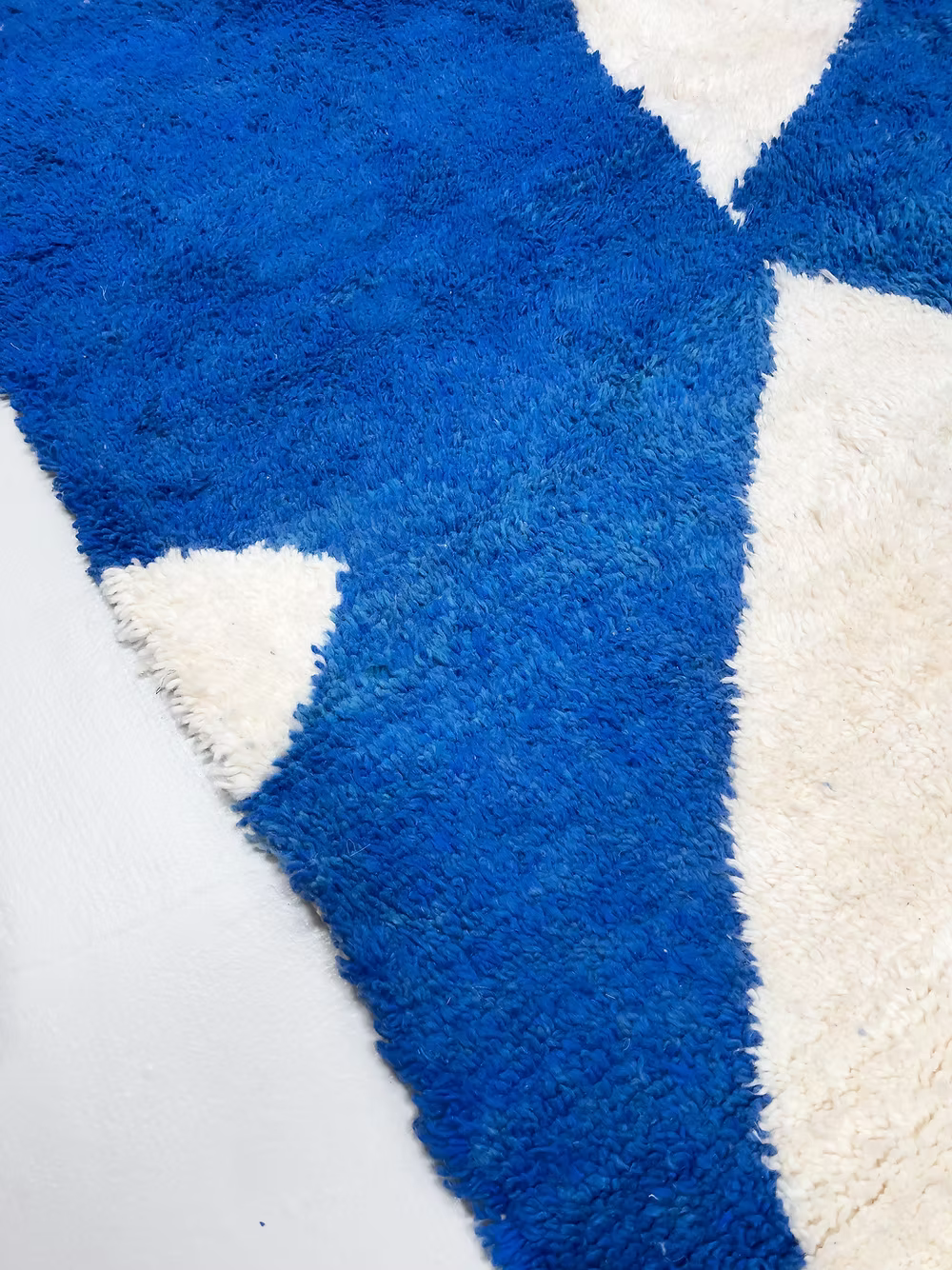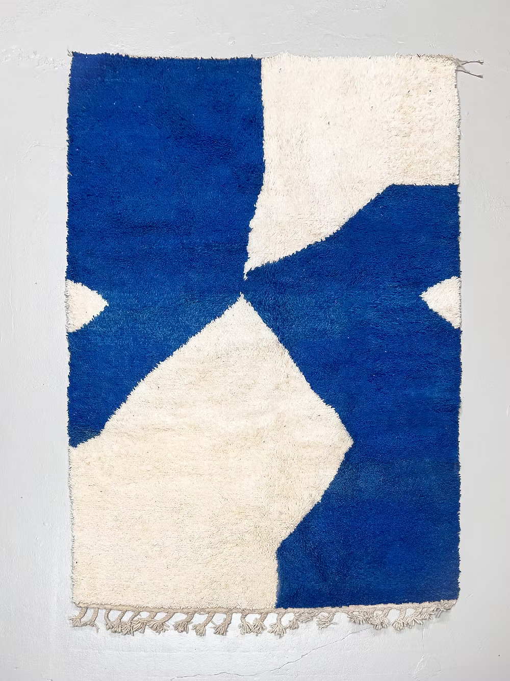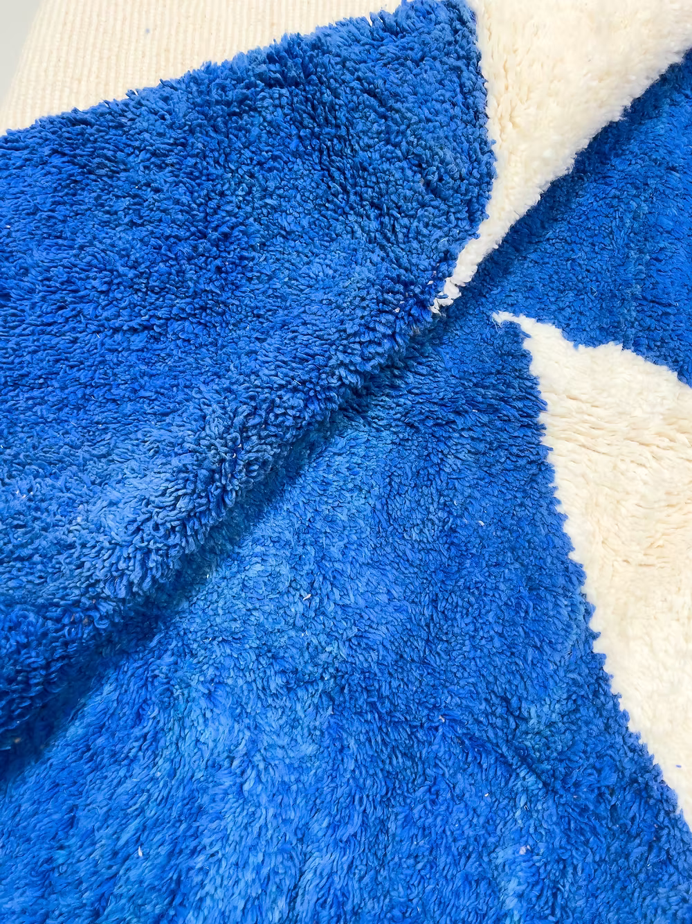 Handwoven in the Atlas Mountains by Berber women, this authentic Beni Ouarain rug carries the calm strength of tradition and the vivid soul of Majorelle blue. Its creamy wool base meets geometric blue lines that recall desert paths under the morning sky. Soft, timeless, and deeply rooted in Moroccan heritage — a piece that tells a story with every thread.