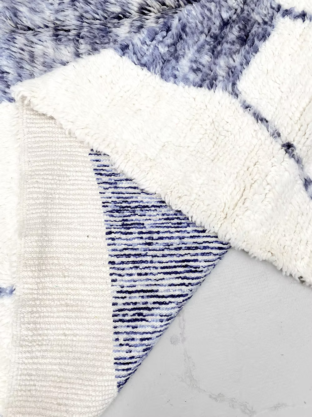 Sourced from the heart of the Atlas Mountains, this rug is meticulously hand-knotted from 100% natural, premium sheep's wool, offering a plush, indulgent high-pile base that confirms its superior quality. The creamy white foundation serves as a gallery wall for the striking design: three vertical, elongated forms like abstract indigo totems dominate the field. The subtle variation in the blue dye within these shapes gives the piece a stunning, watercolor-like depth.