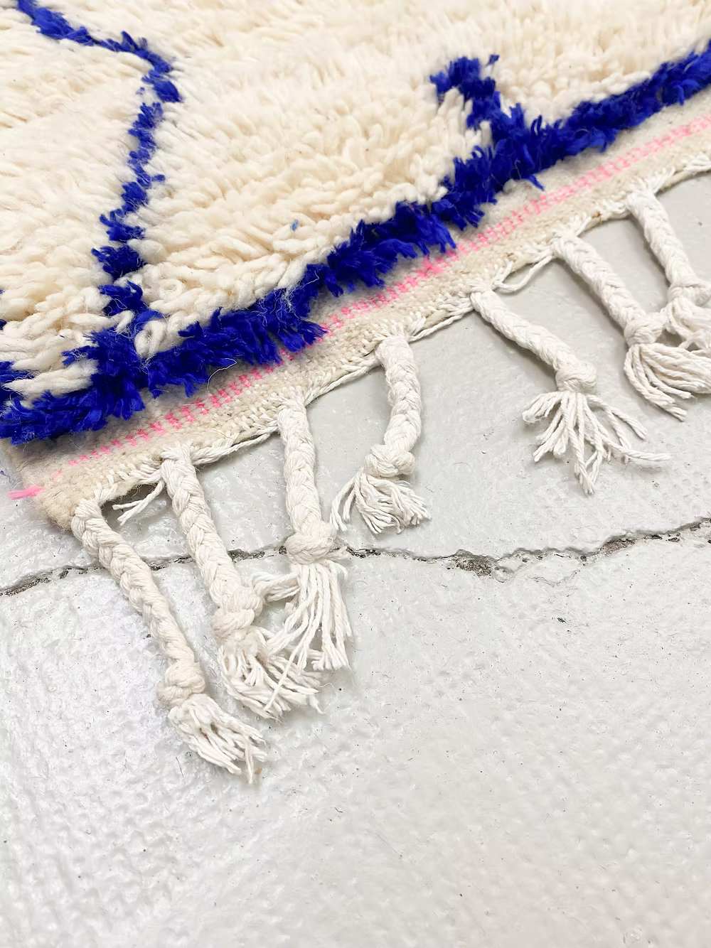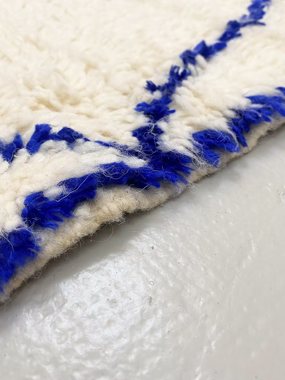 Hand-knotted from 100% sumptuous, natural sheep's wool, this piece boasts the iconic, cloud-like texture for which Beni Ourains are revered. The creamy, rich white canvas is intentionally broken by intricate, hand-drawn indigo blue glyphs and diamond patterns. Unlike standardized luxury rugs, the charming, organic irregularities and tribal symbols showcase the weaver's personal vision a silent, powerful narrative from the High Atlas Mountains.