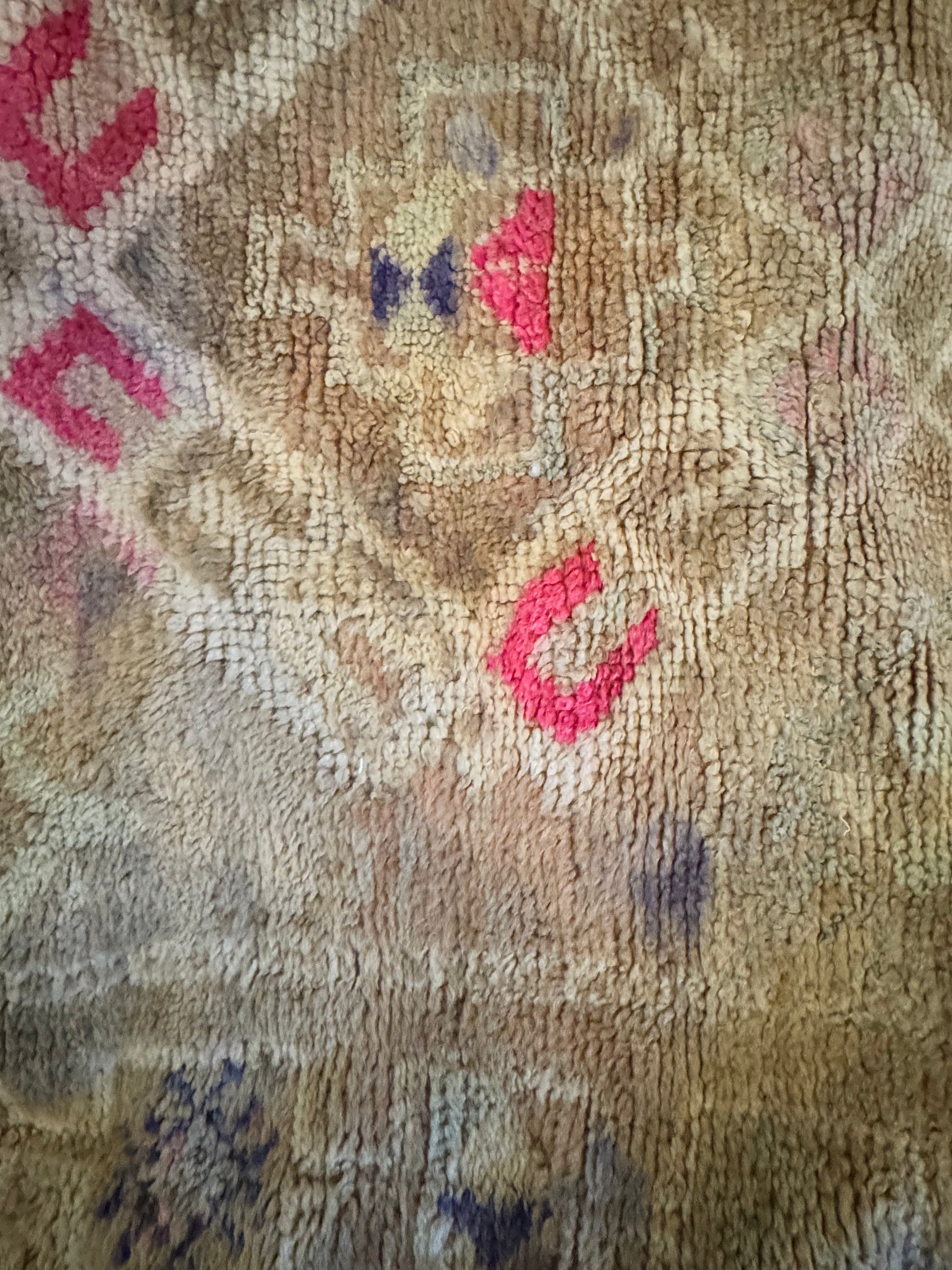 Handmade by Moroccan craftsmen, this pouf is a masterpiece of sustainable history. It’s been upcycled from an authentic, old Berber carpet, which means it’s 100% unique and made of pure, high-quality wool. The soft, sun-faded tones mixed with those playful pink and indigo symbols bring an instant bohemian touch to your interior.