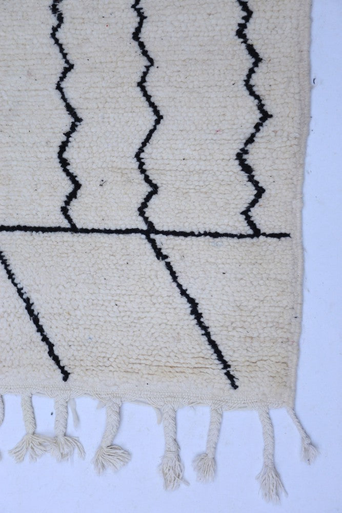 The 'Woven Berber Script' is an authentic piece of textile history. Handwoven from 100% plush wool, its complex, wavy black lines and tribal symbols create a dense, narrative pattern against a creamy ivory field.